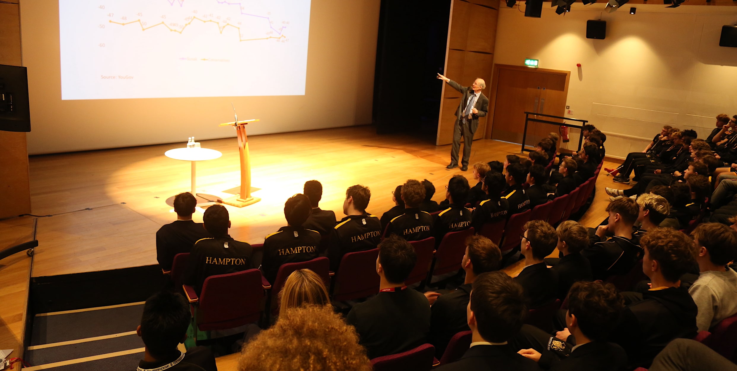 Hamptonians, partner school pupils and members of the local community packed the Hammond Theatre to hear from one of the UK’s leading experts on voting behaviour. Sir John Curtice, Professor of Politics at the University of Strathclyde is a regular media commentator and President of the British Polling Council.