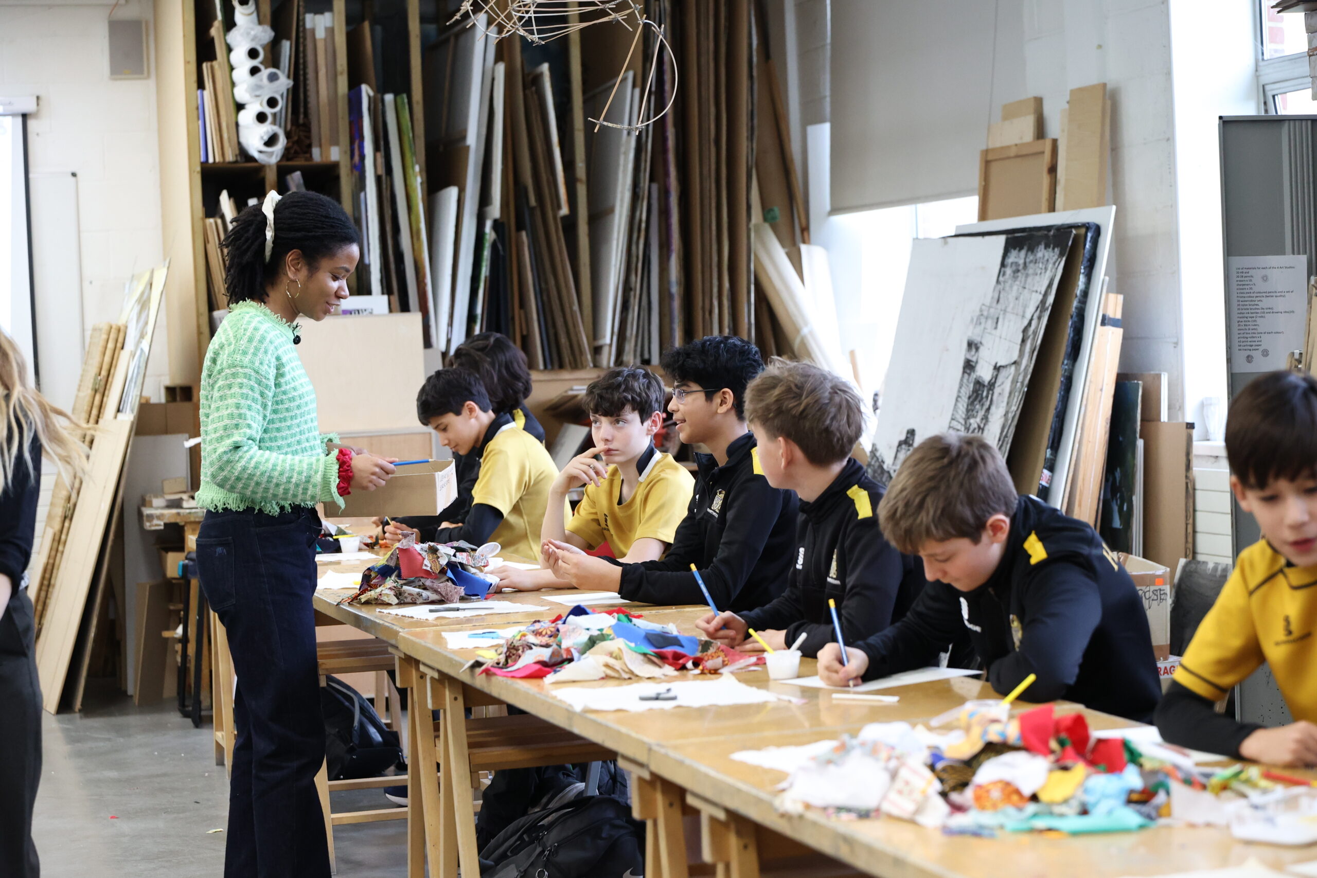 A highlight of the week was a workshop for Second Year Hamptonians, who had the opportunity to work with acclaimed textile designer Jahnavi Iniss. Renowned for her practice celebrating untold stories within Black British history, Jahnavi encouraged pupils to reflect on themes of identity, heritage and personal significance. Each pupil will now produce a textile piece inspired by something important to them, with the finished works set to be displayed as a large collaborative mural in the Dining Hall during the summer term.