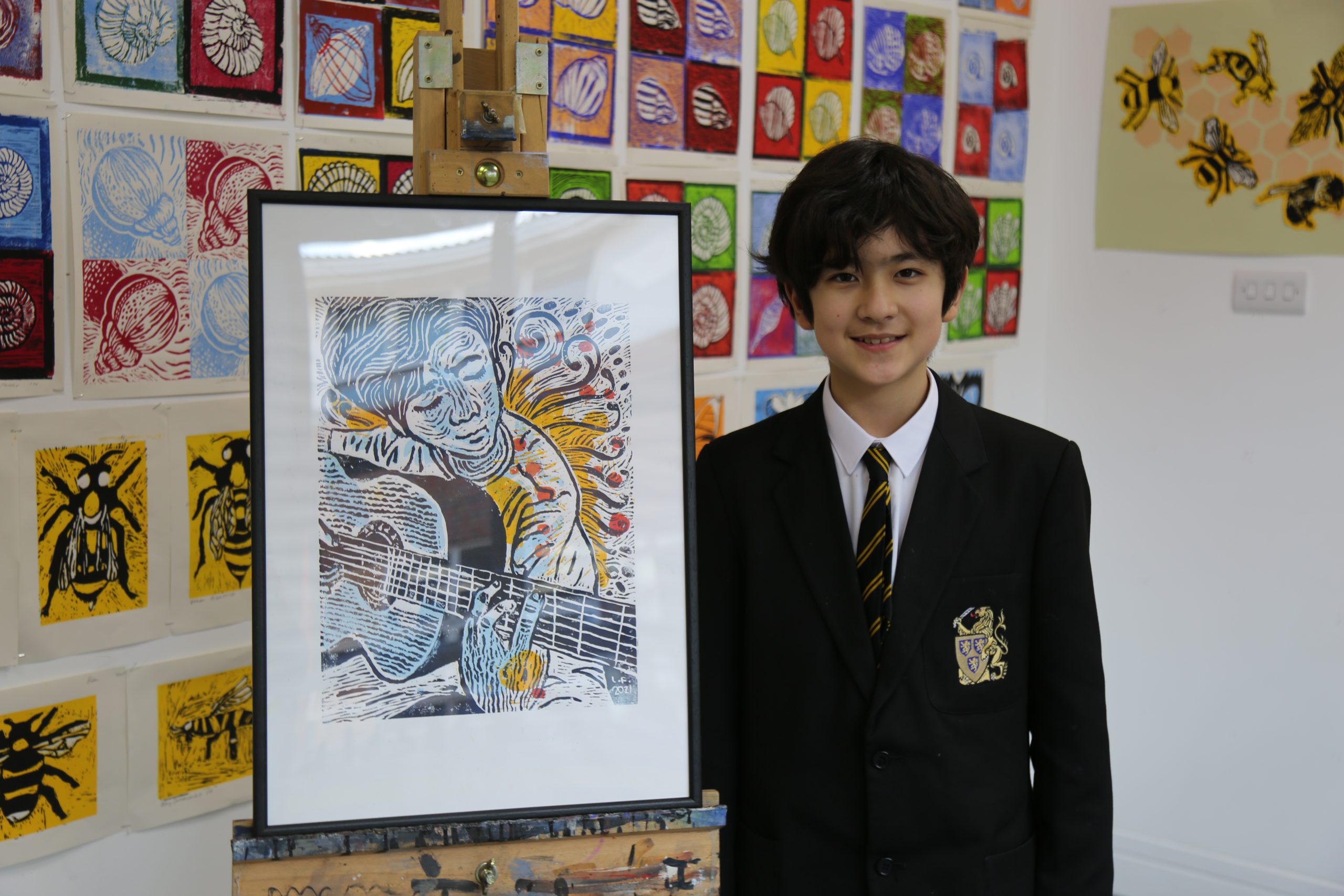 Leonardo spent weeks carving his lino print ‘The Colours of my Notes’ which shows him playing an acoustic guitar. It was selected from thousands of entries to go on display in the 2021 Young Artists’ Summer Show.