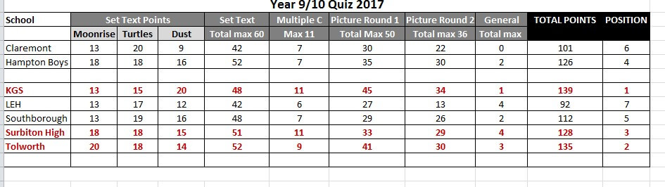 Mrs Colvine was very impressed with the group of Third Year boys who took part in the Kingston Borough Inter-Borough Literature Quiz last week. Sandy M, Samuel C, Mohammed H, Jack E and Oliver P-B are all deserving of credit. Mrs Colvine wants to say a big thank you for your enthusiasm and commitment to the Lit Quiz. She knows how busy you all are and very much appreciated you giving up your free time to read the three set text. Well done for a creditable fourth place finish lads. The team also came top in the set texts rounds, which is a fantastic result. Well done boys.